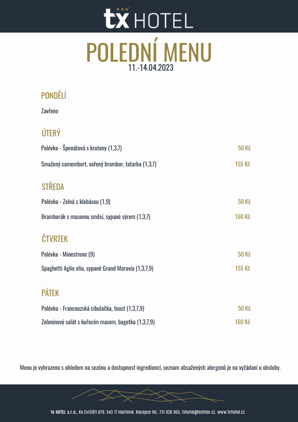 POLEDNÍ MENU 10.-14.04.2023 - TX Hotel