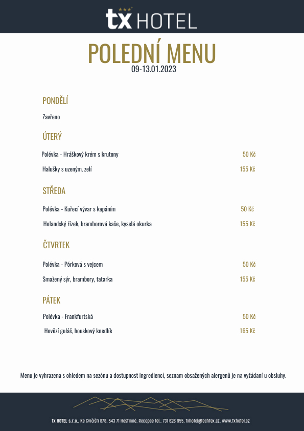 JÍDELNÍ LÍSTEK TX 09.-13.01.2023 - TX Hotel