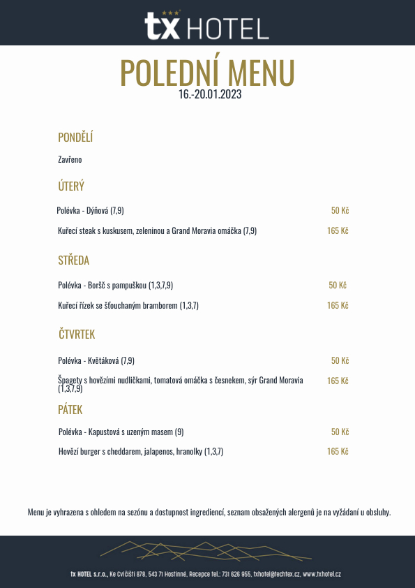 POLEDNÍ MENU 16.-20.01.2023 - TX Hotel